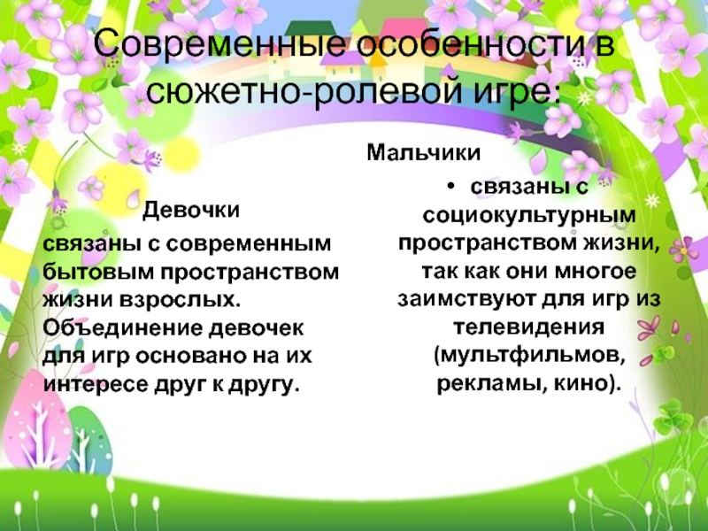 связаны с социокультурным пространством жизни, так как они многое заимствуют для игр из телевидения (мультфильмов, рекламы, кино).
