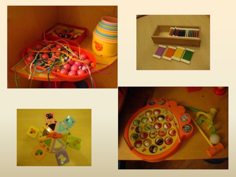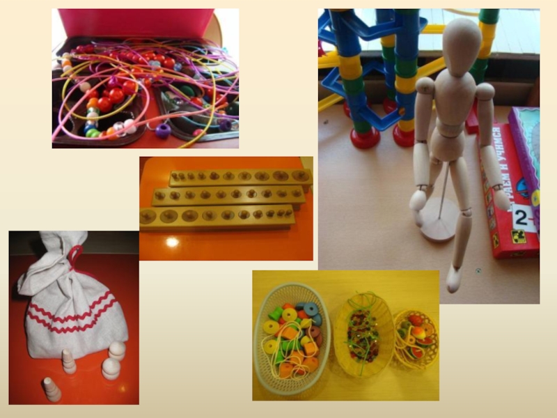набор цветных палочек, набор кубиков с цветными гранями, мозаика, бусы, ленточки, прищепки, колечки, резинки для волос и др.