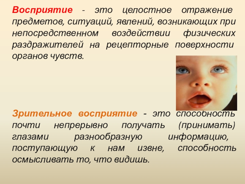 Слайд 2Восприятие - это целостное отражение предметов, ситуаций, явлений, возникающих при непосредственном