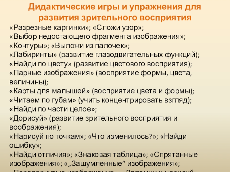 Слайд 5Дидактические игры и упражнения для развития зрительного восприятия