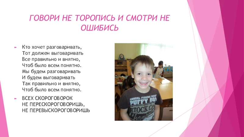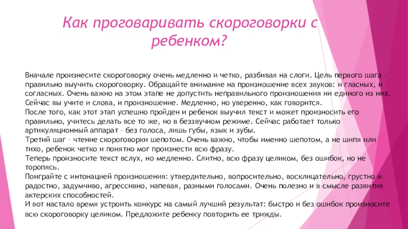 Третий шаг – чтение скороговорки шепотом. Очень важно, чтобы именно шепотом, а не шипя или тихо, ребенок четко и понятно мог произнести всю фразу.