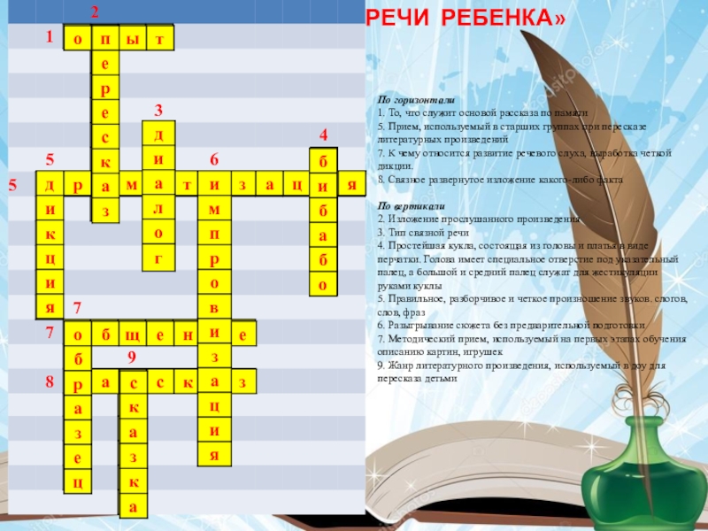 «развитие речи ребенка»   По горизонтали 1. То, что служит основой рассказа по памяти 5. Прием, используемый в