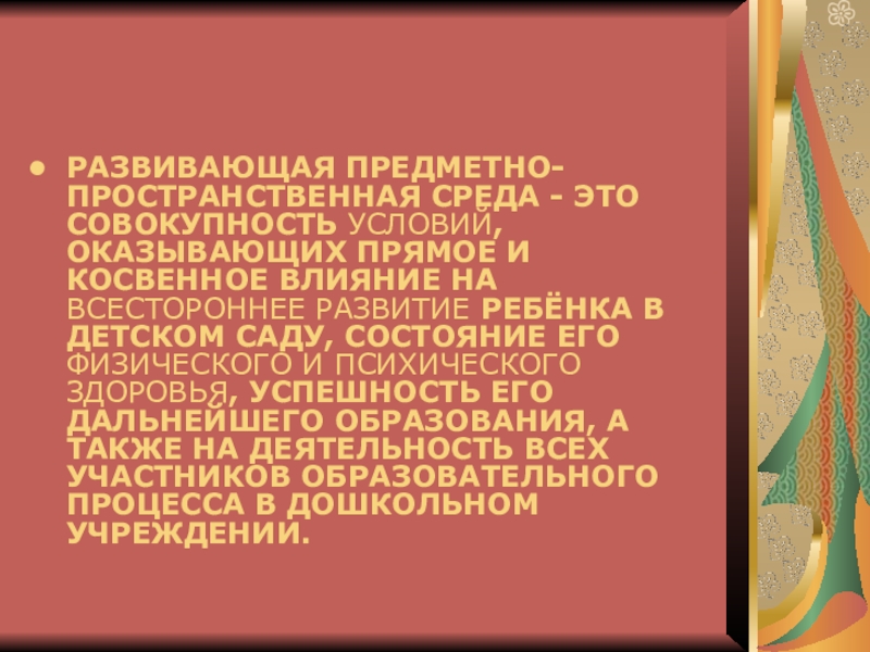 РАЗВИВАЮЩАЯ ПРЕДМЕТНО-ПРОСТРАНСТВЕННАЯ СРЕДА - ЭТО СОВОКУПНОСТЬ УСЛОВИЙ, ОКАЗЫВАЮЩИХ ПРЯМОЕ И КОСВЕННОЕ ВЛИЯНИЕ НА ВСЕСТОРОННЕЕ РАЗВИТИЕ РЕБЁНКА В ДЕТСКОМ САДУ, СОСТОЯНИЕ ЕГО ФИЗИЧЕСКОГО И ПСИХИЧЕСКОГО ЗДОРОВЬЯ, УСПЕШНОСТЬ ЕГО ДАЛЬНЕЙШЕГО ОБРАЗОВАНИЯ, А ТАКЖЕ НА ДЕЯТЕЛЬНОСТЬ ВСЕХ УЧАСТНИКОВ ОБРАЗОВАТЕЛЬНОГО
