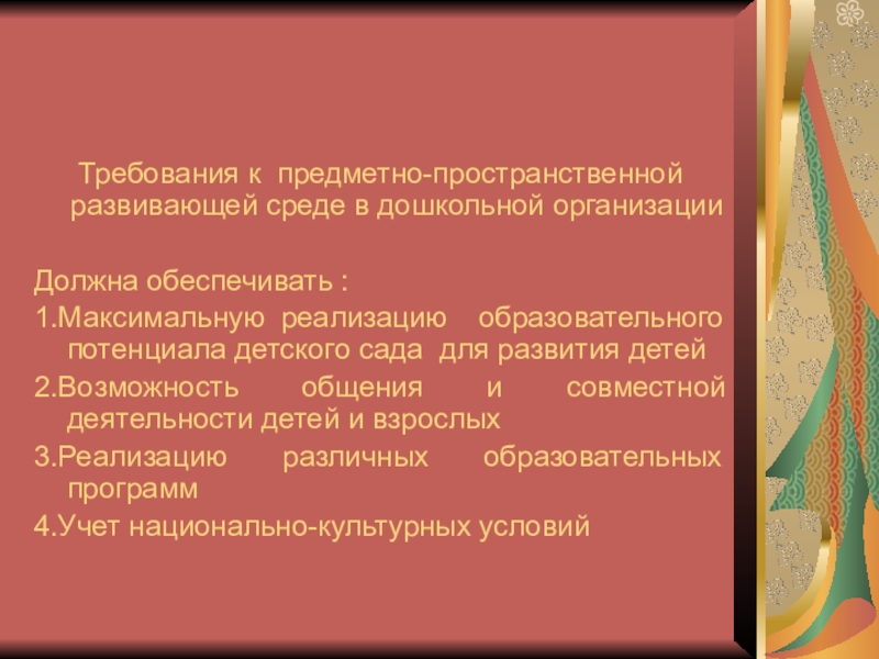 Требования к предметно-пространственной развивающей среде в дошкольной организацииДолжна обеспечивать :1.Максимальную реализацию образовательного потенциала детского сада для развития