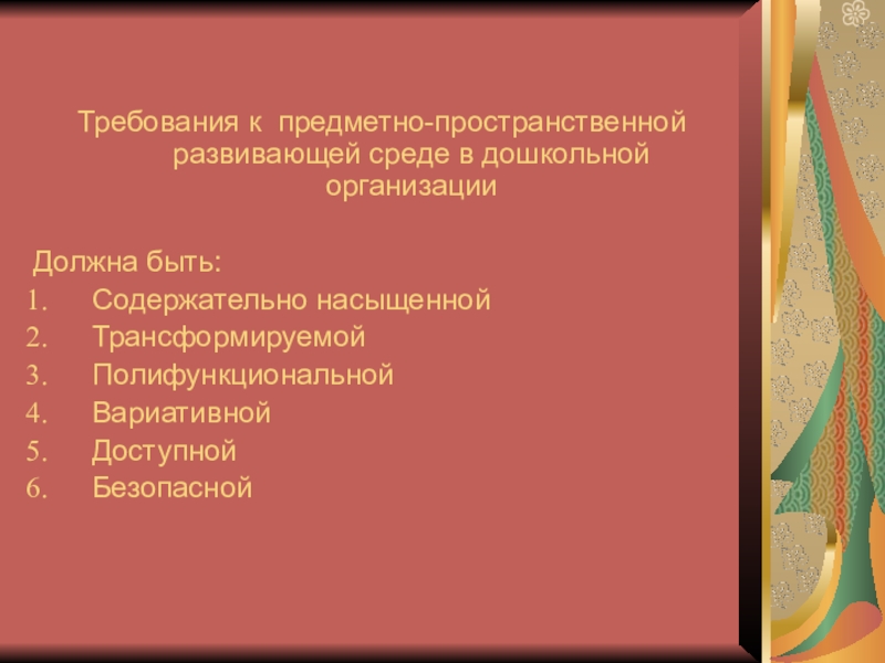 Требования к предметно-пространственной развивающей среде в дошкольной организацииДолжна быть:Содержательно насыщеннойТрансформируемойПолифункциональнойВариативнойДоступнойБезопасной