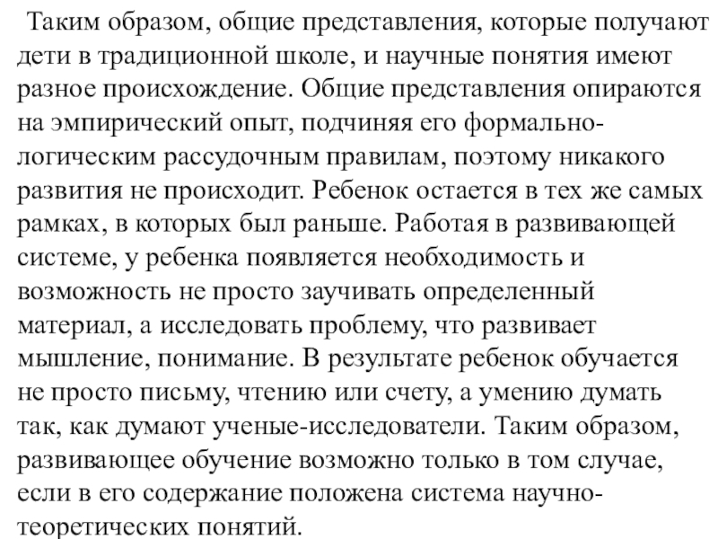 понятия имеют разное происхождение. Общие представления опираются на эмпирический опыт, подчиняя его формально-логическим рассудочным правилам, поэтому никакого развития не происходит. Ребенок остается в тех же самых рамках, в которых был раньше. Работая в развивающей системе, у ребенка появляется необходимость и возможность не просто заучивать определенный материал, а исследовать проблему, что развивает мышление, понимание. В результате ребенок обучается не просто письму, чтению или счету, а умению думать так, как думают ученые-исследователи. Таким образом, развивающее обучение возможно только в том случае, если в его содержание положена система научно- теоретических понятий.