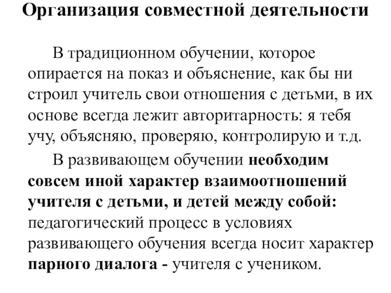 деятельность не только учителя и ученика, но и учащихся между собой. В результате рождается сопоставление точек зрения, анализ, вырабатывается общая позиция. В развивающем обучении деятельность может быть только коллективной, совместно распределенной. Учитель в нее включается как равноправный участник идеи. При этом совершенно исключаются все авторитарные формы, прежде всего, формы оценки.