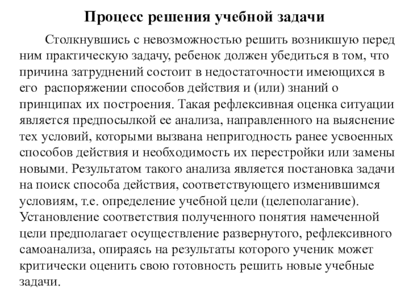 задачу, ребенок должен убедиться в том, что причина затруднений состоит в недостаточности имеющихся в его распоряжении способов действия и (или) знаний о принципах их построения. Такая рефлексивная оценка ситуации является предпосылкой ее анализа, направленного на выяснение тех условий, которыми вызвана непригодность ранее усвоенных способов действия и необходимость их перестройки или замены новыми. Результатом такого анализа является постановка задачи на поиск способа действия, соответствующего изменившимся условиям, т.е. определение учебной цели (целеполагание). Установление соответствия полученного понятия намеченной цели предполагает осуществление развернутого, рефлексивного самоанализа, опираясь на результаты которого ученик может критически оценить свою готовность решить новые учебные задачи.