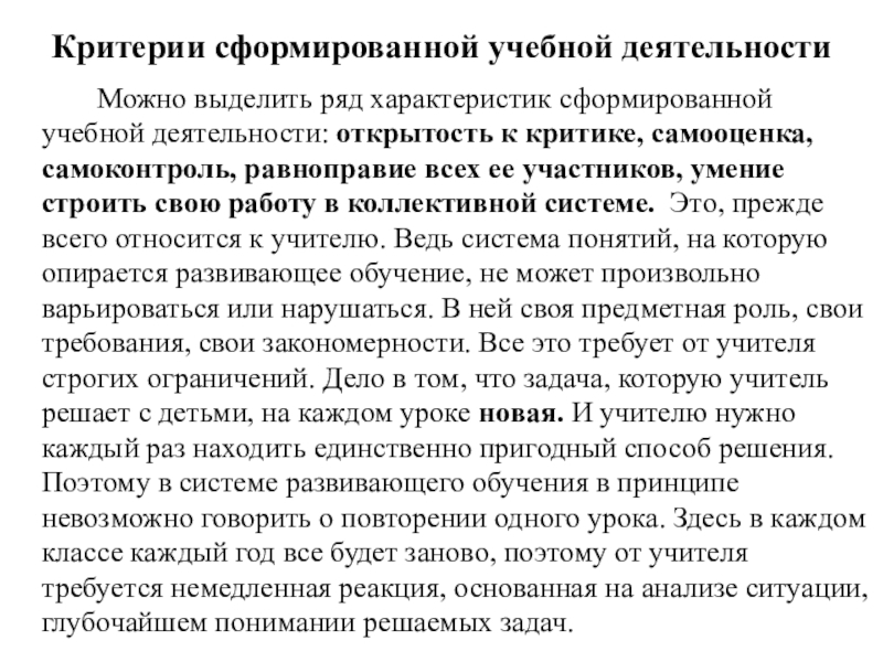 критике, самооценка, самоконтроль, равноправие всех ее участников, умение строить свою работу в коллективной системе. Это, прежде всего относится к учителю. Ведь система понятий, на которую опирается развивающее обучение, не может произвольно варьироваться или нарушаться. В ней своя предметная роль, свои требования, свои закономерности. Все это требует от учителя строгих ограничений. Дело в том, что задача, которую учитель решает с детьми, на каждом уроке новая. И учителю нужно каждый раз находить единственно пригодный способ решения. Поэтому в системе развивающего обучения в принципе невозможно говорить о повторении одного урока. Здесь в каждом классе каждый год все будет заново, поэтому от учителя требуется немедленная реакция, основанная на анализе ситуации, глубочайшем понимании решаемых задач.