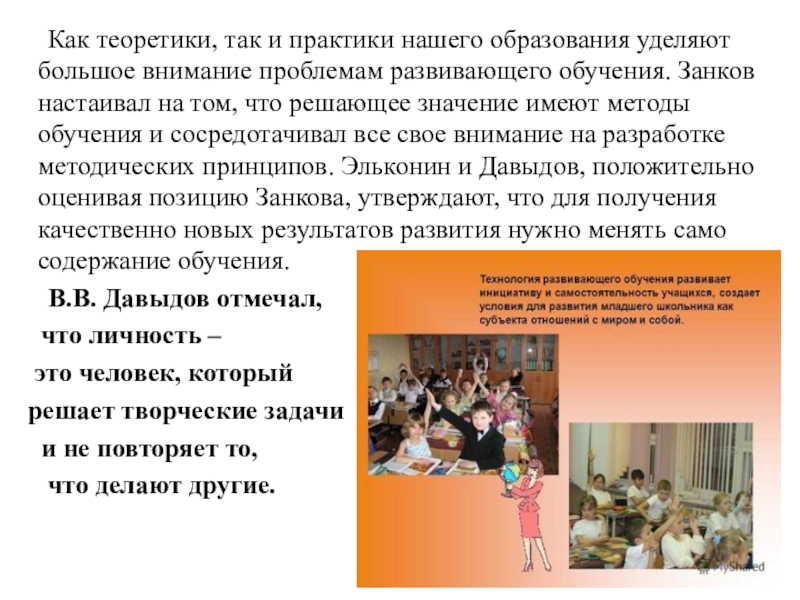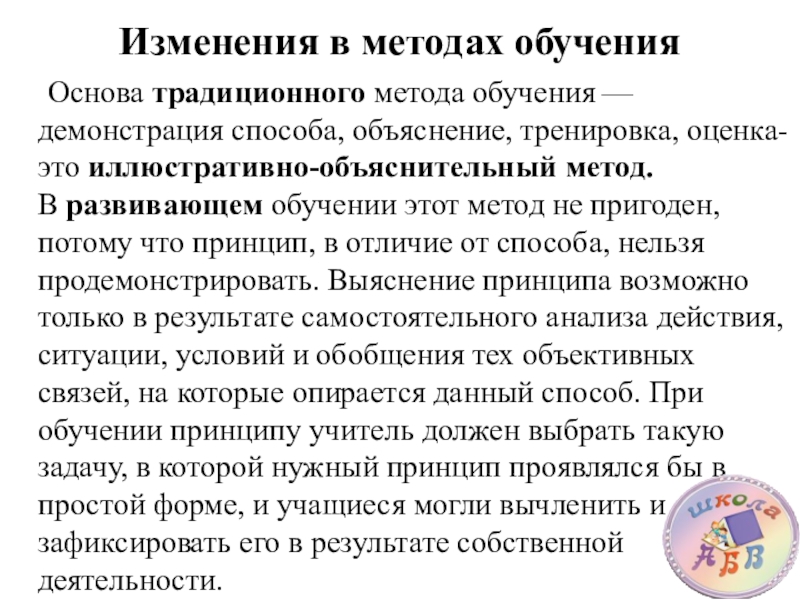 развивающего обучения. Занков настаивал на том, что решающее значение имеют методы обучения и сосредотачивал все свое внимание на разработке методических принципов. Эльконин и Давыдов, положительно оценивая позицию Занкова, утверждают, что для получения качественно новых результатов развития нужно менять само содержание обучения.