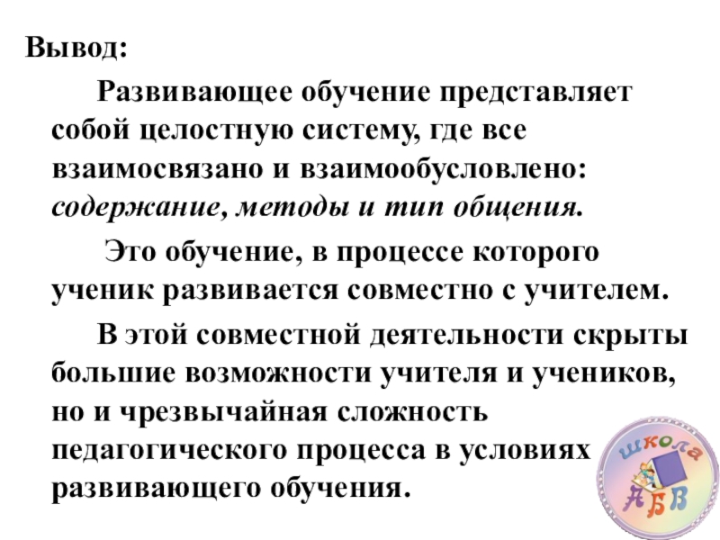 Развивающее обучение представляет собой целостную систему, где все взаимосвязано и взаимообусловлено: