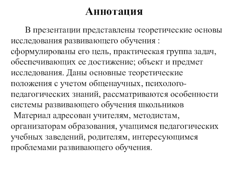 В презентации представлены теоретические основы исследования развивающего обучения : сформулированы его