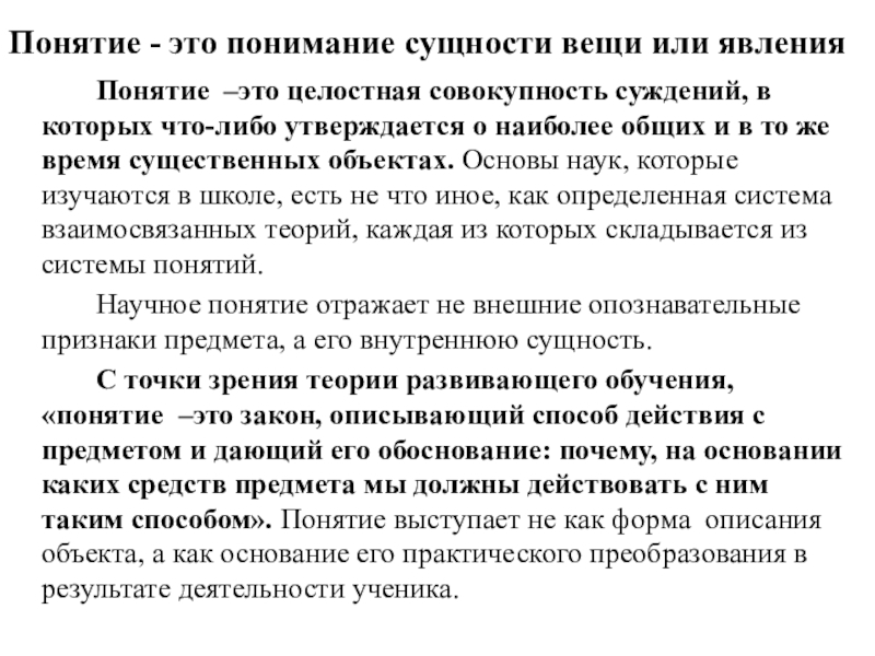 С точки зрения теории развивающего обучения, «понятие –это закон, описывающий способ действия с предметом и дающий его обоснование: почему, на основании каких средств предмета мы должны действовать с ним таким способом». Понятие выступает не как форма описания объекта, а как основание его практического преобразования в результате деятельности ученика.