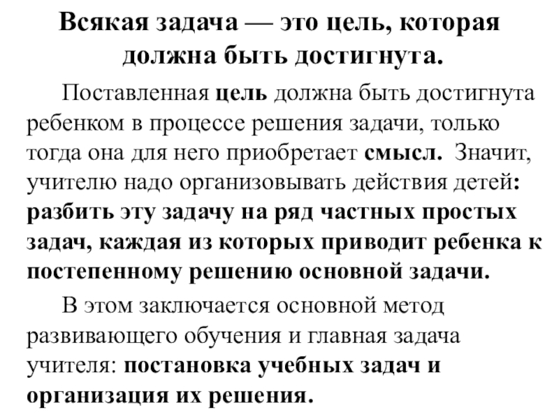 должна быть достигнута ребенком в процессе решения задачи, только тогда она для него приобретает смысл. Значит, учителю надо организовывать действия детей: разбить эту задачу на ряд частных простых задач, каждая из которых приводит ребенка к постепенному решению основной задачи.