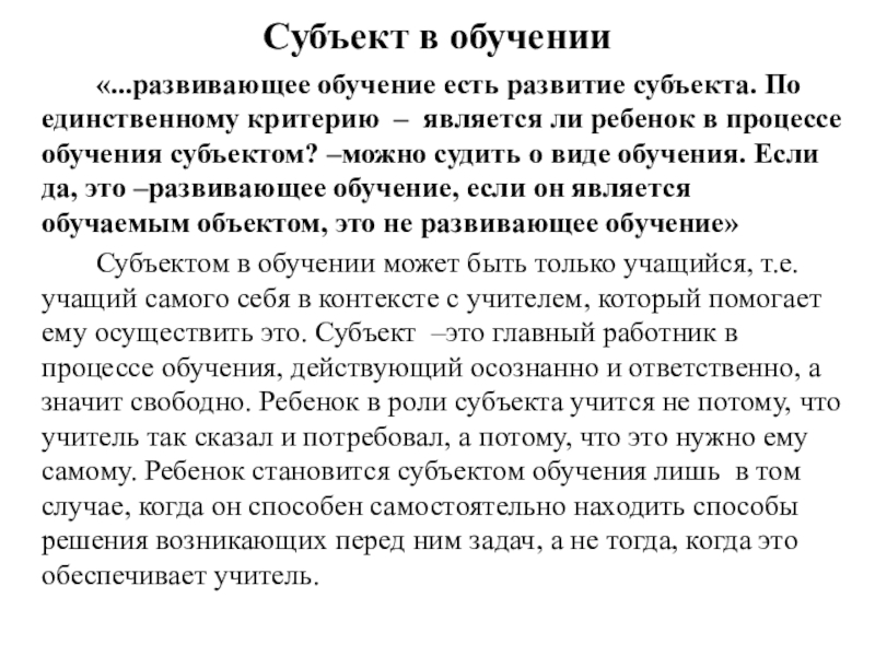 является ли ребенок в процессе обучения субъектом? –можно судить о виде обучения. Если да, это –развивающее обучение, если он является обучаемым объектом, это не развивающее обучение»