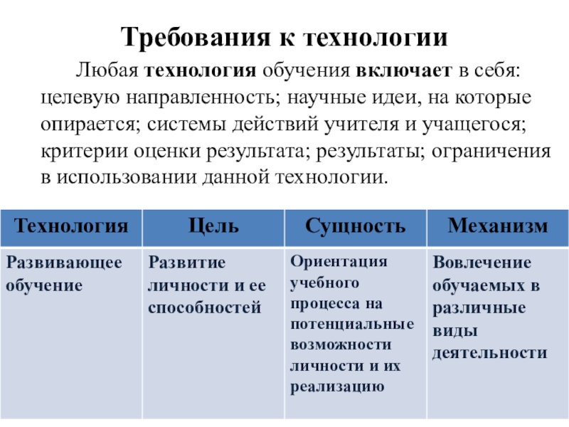 идеи, на которые опирается; системы действий учителя и учащегося; критерии оценки результата; результаты; ограничения в использовании данной технологии.