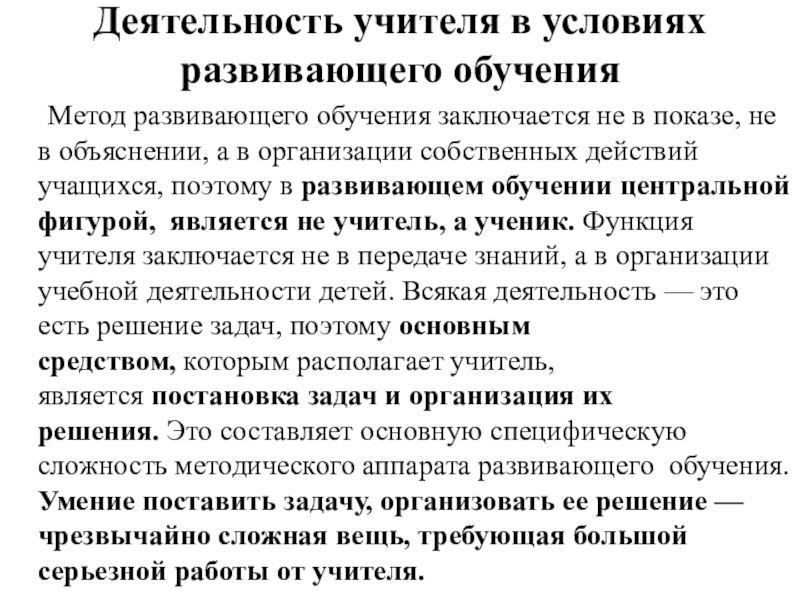 показе, не в объяснении, а в организации собственных действий учащихся, поэтому в развивающем обучении центральной фигурой, является не учитель, а ученик. Функция учителя заключается не в передаче знаний, а в организации учебной деятельности детей. Всякая деятельность — это есть решение задач, поэтому основным средством, которым располагает учитель, является постановка задач и организация их решения. Это составляет основную специфическую сложность методического аппарата развивающего обучения. Умение поставить задачу, организовать ее решение — чрезвычайно сложная вещь, требующая большой серьезной работы от учителя.