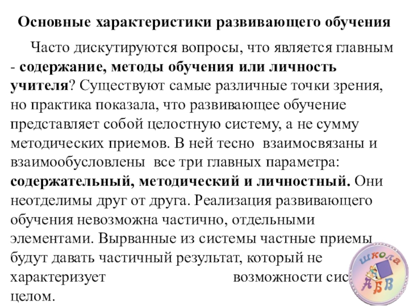 обучения или личность учителя? Существуют самые различные точки зрения, но практика показала, что развивающее обучение представляет собой целостную систему, а не сумму методических приемов. В ней тесно взаимосвязаны и взаимообусловлены все три главных параметра: содержательный, методический и личностный. Они неотделимы друг от друга. Реализация развивающего обучения невозможна частично, отдельными элементами. Вырванные из системы частные приемы будут давать частичный результат, который не характеризует возможности системы в целом.