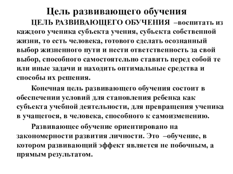 Конечная цель развивающего обучения состоит в обеспечении условий для становления ребенка как субъекта учебной деятельности, для превращения ученика в учащегося, в человека, способного к самоизменению.