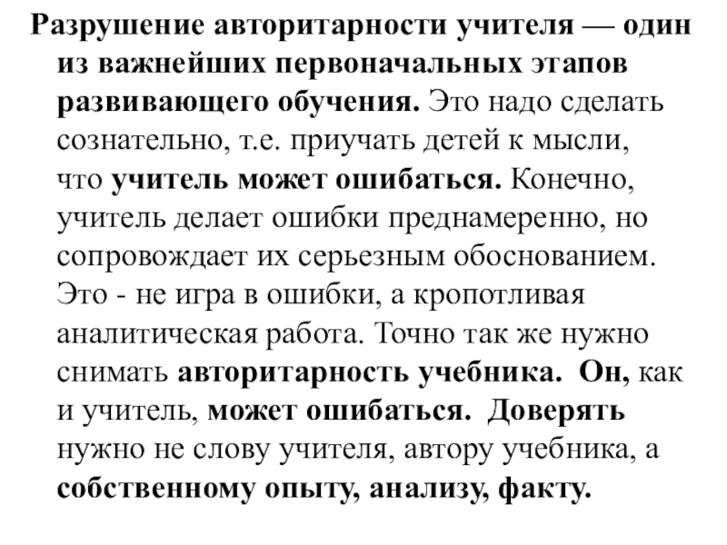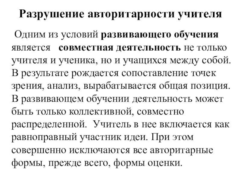 Разрушение авторитарности учителя — один из важнейших первоначальных этапов развивающего обучения. Это