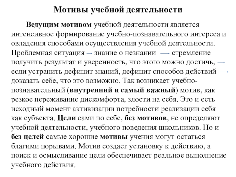 и овладения способами осуществления учебной деятельности. Проблемная ситуация знание о незнании стремление получить результат и уверенность, что этого можно достичь, если устранить дефицит знаний, дефицит способов действий доказать себе, что это возможно. Так возникает учебно-познавательный (внутренний и самый важный) мотив, как резкое переживание дискомфорта, злости на себя. Это и есть исходный момент активизации потребности реализации себя как субъекта. Цели сами по себе, без мотивов, не определяют учебной деятельности, учебного поведения школьников. Но и без целей самые хорошие мотивы учения могут остаться благими порывами. Мотив создает установку к действию, а поиск и осмысливание цели обеспечивает реальное выполнение учебного действия.