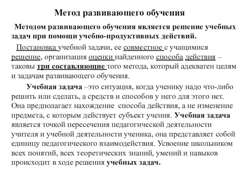 Постановка учебной задачи, ее совместное с учащимися решение, организация оценки найденного способа действия –таковы три составляющие того метода, который адекватен целям и задачам развивающего обучения.