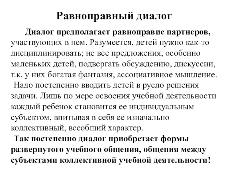 как-то дисциплинировать; не все предложения, особенно маленьких детей, подвергать обсуждению, дискуссии, т.к. у них богатая фантазия, ассоциативное мышление. Надо постепенно вводить детей в русло решения задачи. Лишь по мере освоения учебной деятельности каждый ребенок становится ее индивидуальным субъектом, впитывая в себя ее изначально коллективный, всеобщий характер. Так постепенно диалог приобретает формы развернутого учебного общения, общения между субъектами коллективной учебной деятельности!
