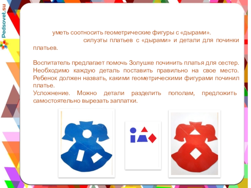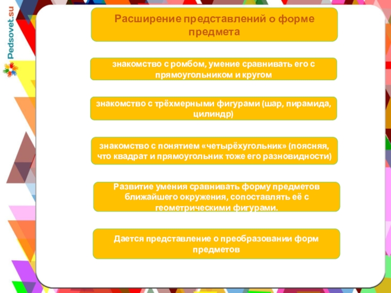 Развитие умения сравнивать форму предметов ближайшего окружения, сопоставлять её с геометрическими фигурами.