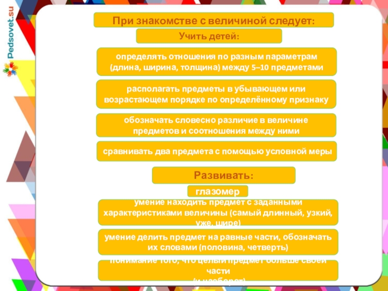 умение находить предмет с заданными характеристиками величины (самый длинный, узкий, уже, шире)
