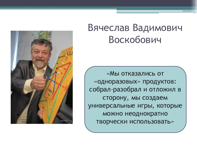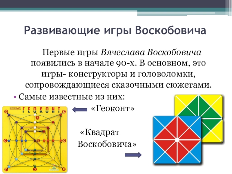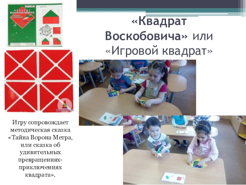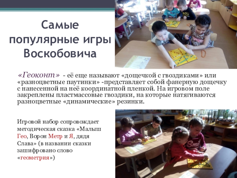 Игровой набор сопровождает методическая сказка «Малыш Гео, Ворон Метр и Я, дядя Слава» (в названии сказки зашифровано слово «геометрия»)