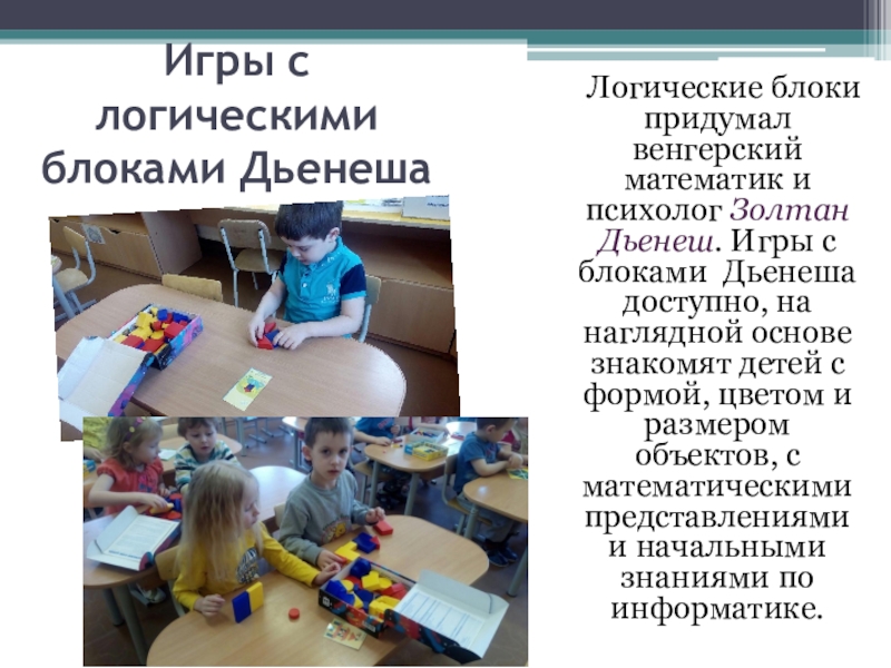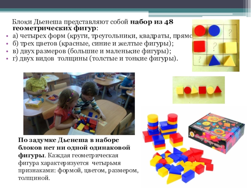 По задумке Дьенеша в наборе блоков нет ни одной одинаковой фигуры. Каждая геометрическая фигура характеризуется четырьмя признаками: формой, цветом, размером, толщиной.