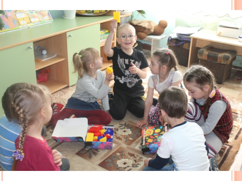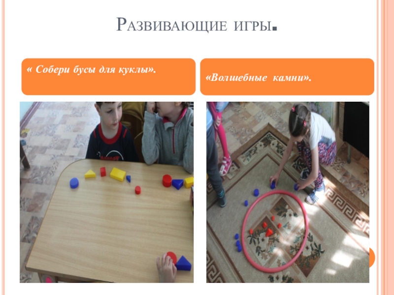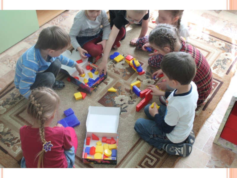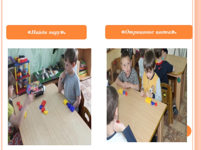 Содержание: Предложить детям разделиться на пары. У каждой пары набор логических блоков, игроки поровну делят фигуры между собой и по очереди выкладывают их. Сначала первый участник выкладывает свою фигуру, второй игрок ищет к ней пару, если он правильно составляет пару, то забирает обе фигуры себе, если же ошибается, то его фигура попадает к первому игроку. Далее свою фигуру выставляет второй игрок. Побеждает тот, кто соберет больше фигур.