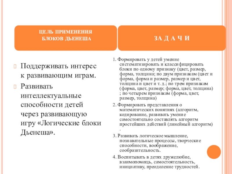 1. Формировать у детей умение систематизировать и классифицировать блоки по одному признаку (цвет, размер, форма, толщина; по двум признакам (цвет и форма, форма и размер, размер и цвет, толщина и цвет и т. д.; по трем признакам (форма, цвет, размер; форма, цвет, толщина) ; по четырем признакам (форма, цвет, размер, толщина)