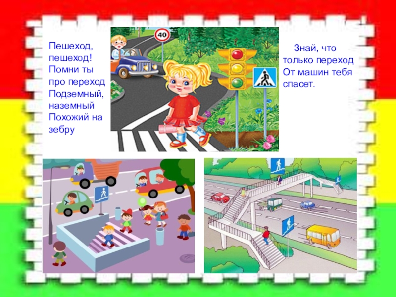 Пешеход, пешеход! Помни ты про переход Подземный, наземный Похожий на зебру   Знай, что только переход