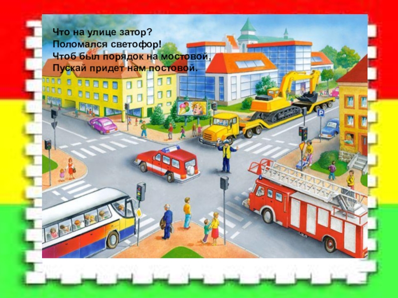 . Что на улице затор?Поломался светофор! Чтоб был порядок на мостовой,Пускай придет нам постовой.