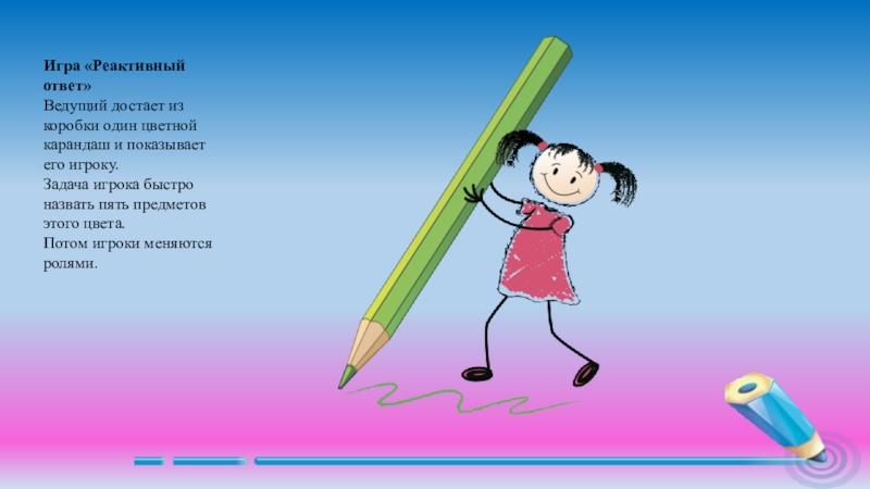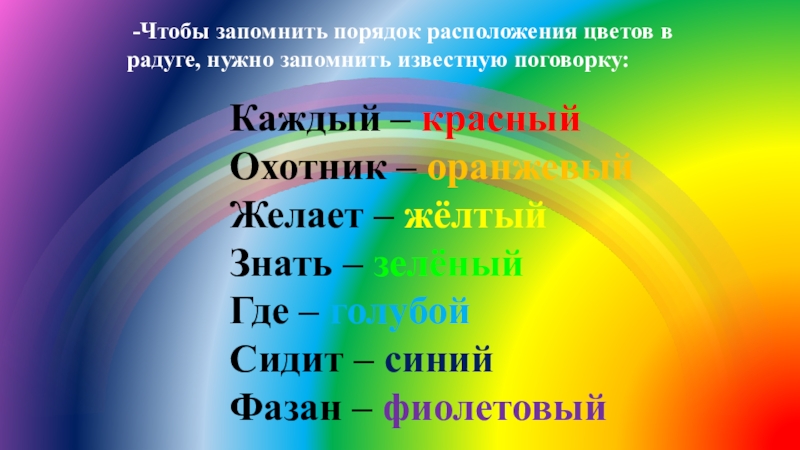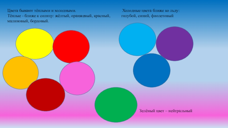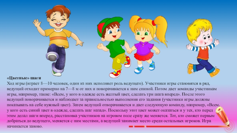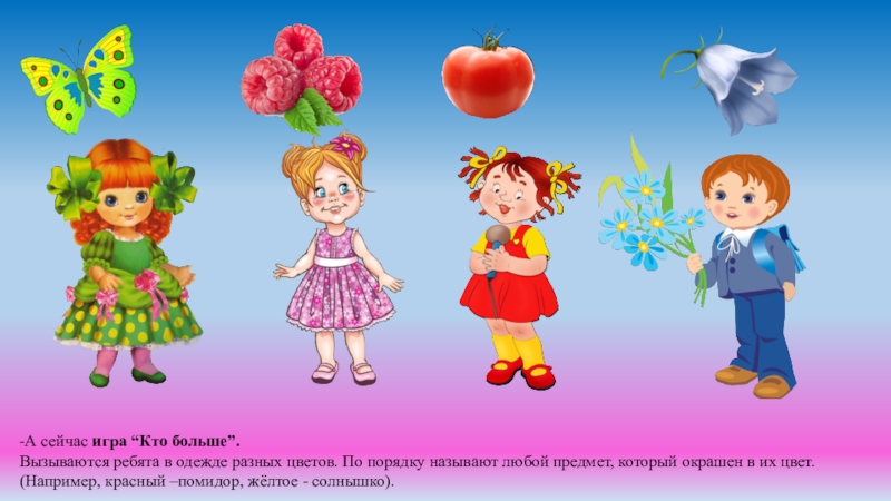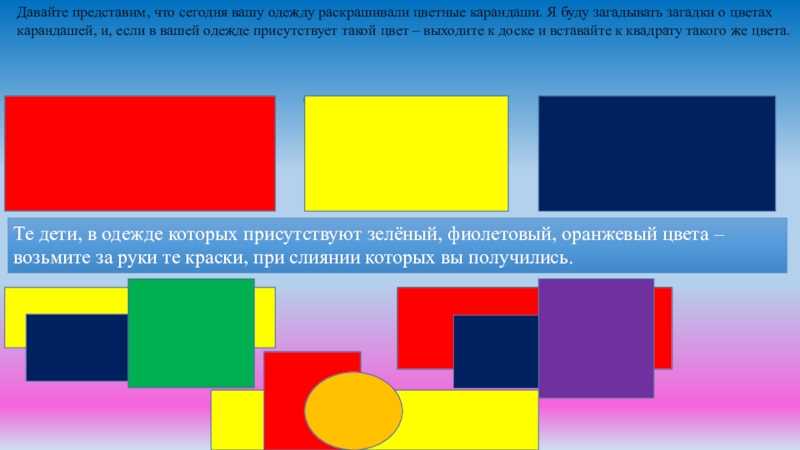 -Это главные, основные цвета. Все другие цвета и оттенки получают из слияний этих цветов, путём смешивания. Все, у кого наряд не основного цвета – слушайте внимательно, чтобы тоже принять участие в игре.