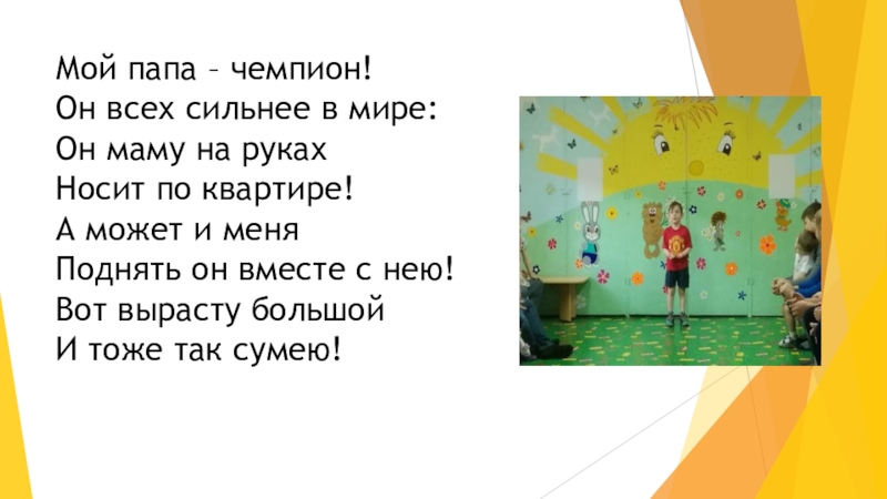 Слайд 5Мой папа – чемпион! Он всех сильнее в мире: Он маму на руках
