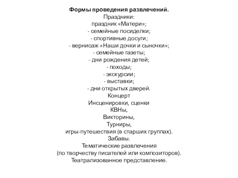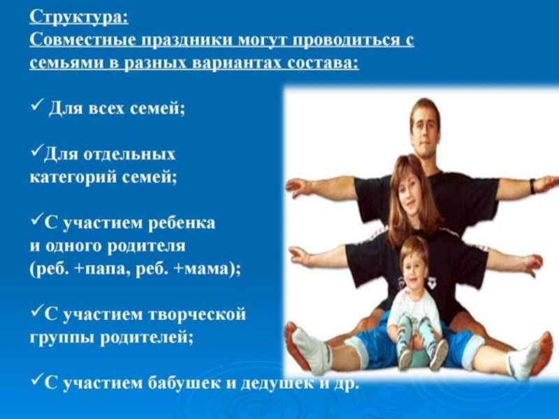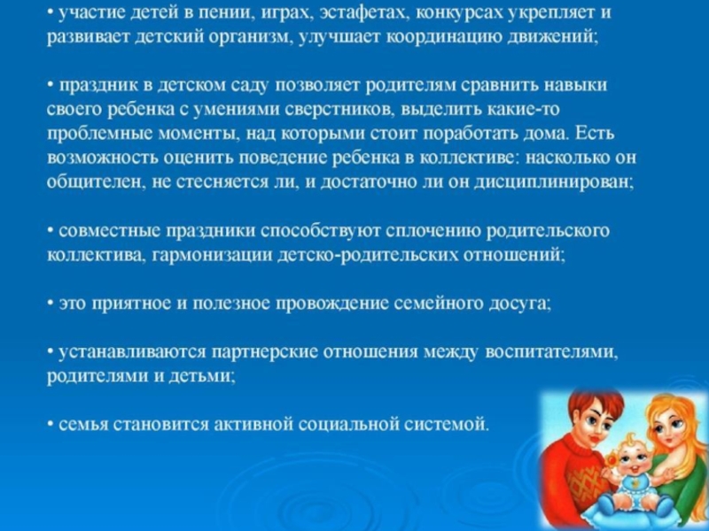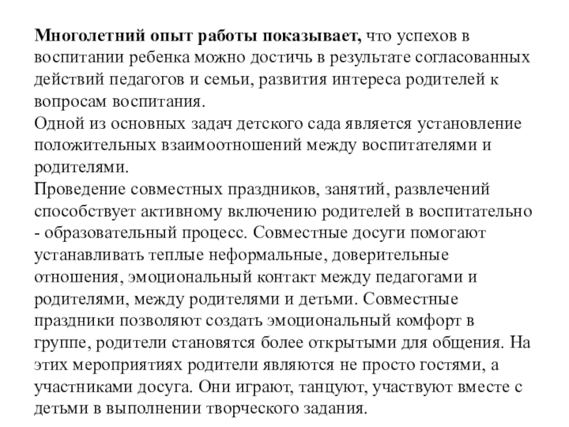 Проведение совместных праздников, занятий, развлечений способствует активному включению родителей в воспитательно - образовательный процесс. Совместные досуги помогают устанавливать теплые неформальные, доверительные отношения, эмоциональный контакт между педагогами и родителями, между родителями и детьми. Совместные праздники позволяют создать эмоциональный комфорт в группе, родители становятся более открытыми для общения. На этих мероприятиях родители являются не просто гостями, а участниками досуга. Они играют, танцуют, участвуют вместе с детьми в выполнении творческого задания.