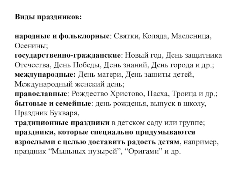 народные и фольклорные: Святки, Коляда, Масленица, Осенины;