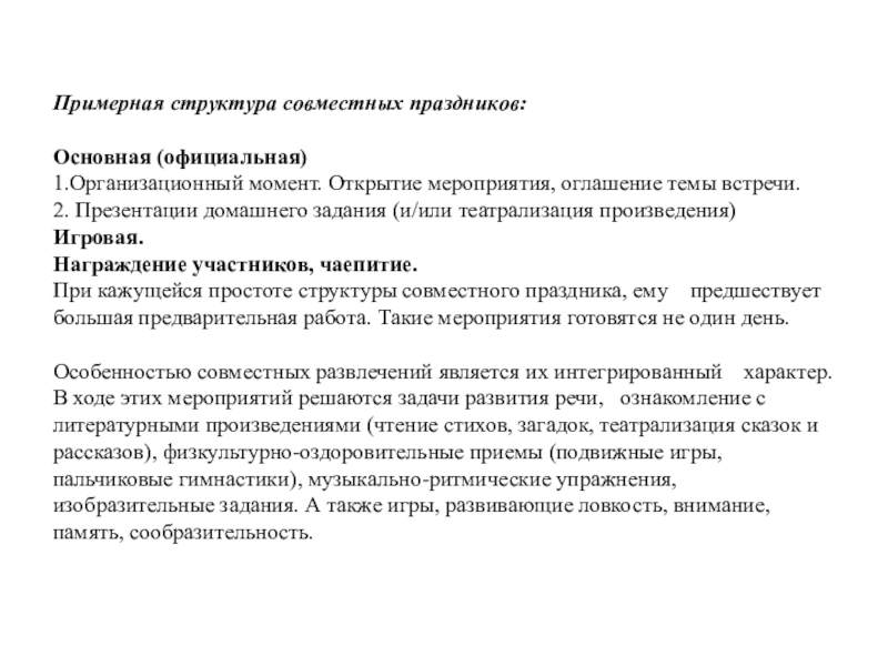 Особенностью совместных развлечений является их интегрированный характер. В ходе этих мероприятий решаются задачи развития речи, ознакомление с литературными произведениями (чтение стихов, загадок, театрализация сказок и рассказов), физкультурно-оздоровительные приемы (подвижные игры, пальчиковые гимнастики), музыкально-ритмические упражнения, изобразительные задания. А также игры, развивающие ловкость, внимание, память, сообразительность.