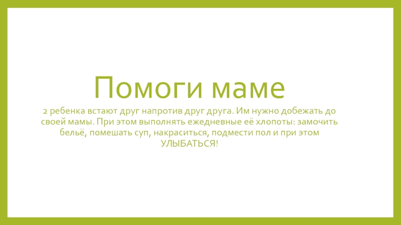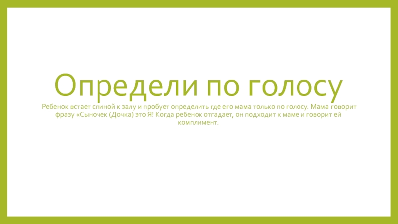 его мама только по голосу. Мама говорит фразу «Сыночек (Дочка) это Я! Когда ребенок отгадает, он подходит к маме и говорит ей комплимент.