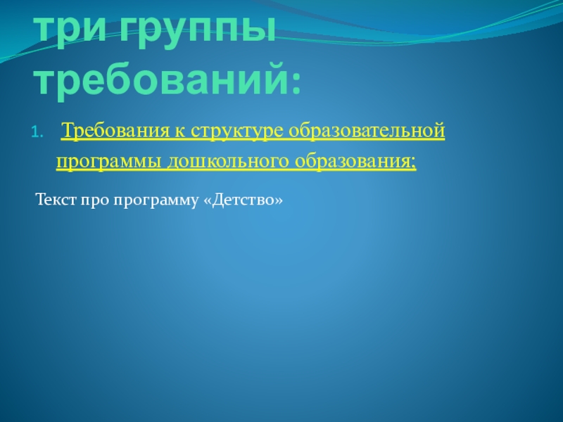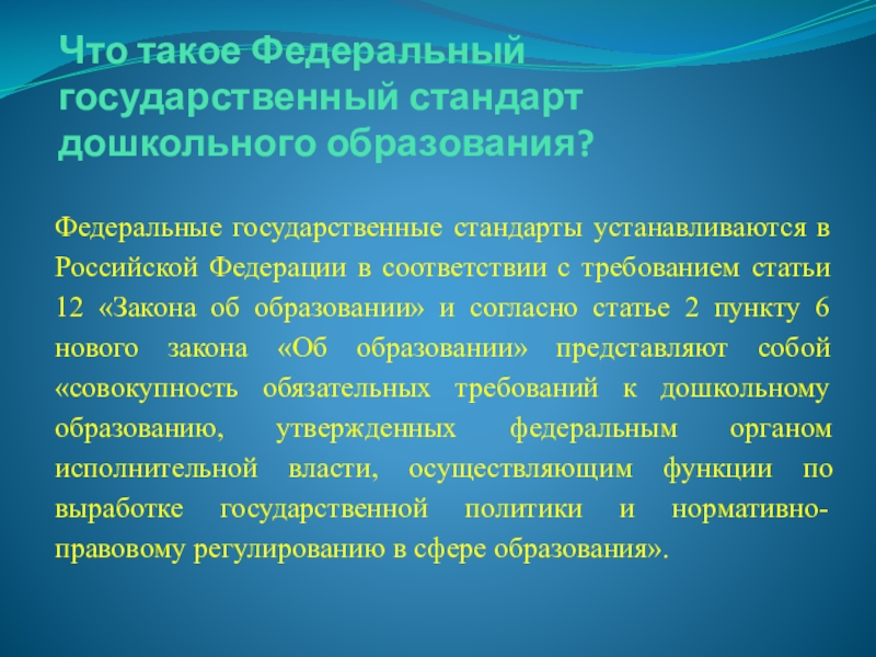 Российской Федерации в соответствии с требованием статьи 12 «Закона об образовании» и согласно статье 2 пункту 6 нового закона «Об образовании» представляют собой «совокупность обязательных требований к дошкольному образованию, утвержденных федеральным органом исполнительной власти, осуществляющим функции по выработке государственной политики и нормативно-правовому регулированию в сфере образования».
