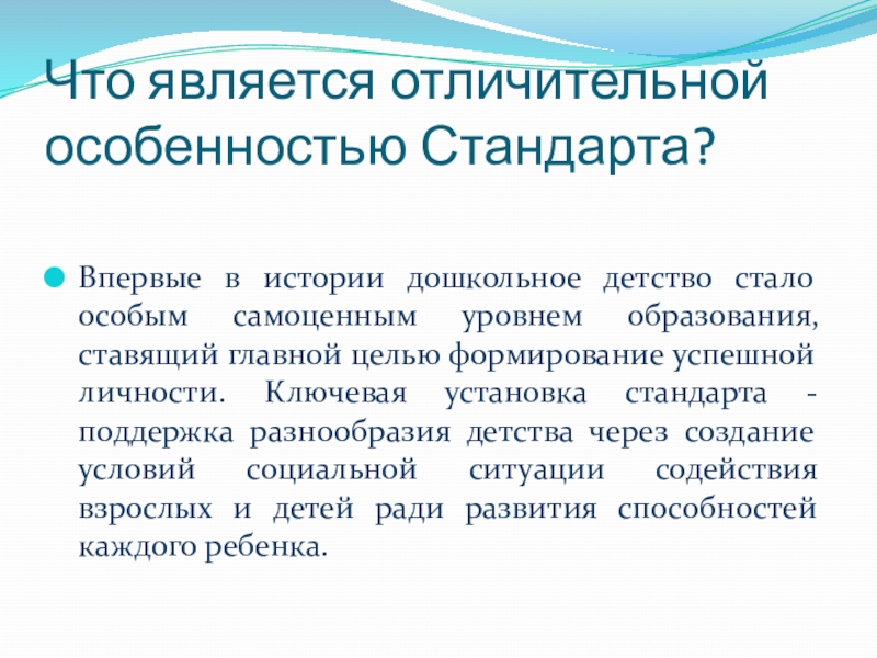 самоценным уровнем образования, ставящий главной целью формирование успешной личности. Ключевая установка стандарта - поддержка разнообразия детства через создание условий социальной ситуации содействия взрослых и детей ради развития способностей каждого ребенка.