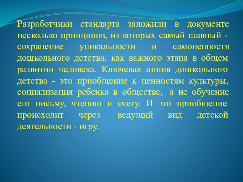 - сохранение уникальности и самоценности дошкольного детства, как важного этапа в общем развитии человека. Ключевая линия дошкольного детства - это приобщение к ценностям культуры, социализация ребенка в обществе, а не обучение его письму, чтению и счету. И это приобщение происходит через ведущий вид детской деятельности - игру.