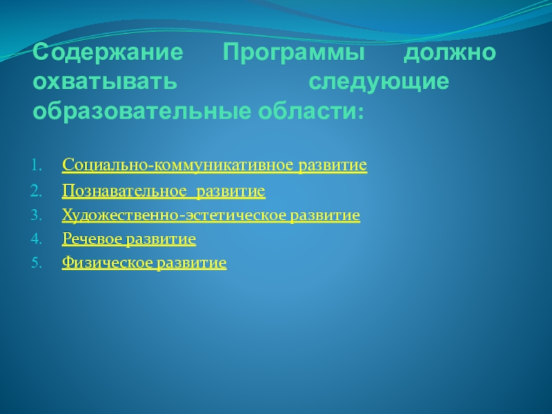 Слайд 16Содержание Программы должно охватывать следующие образовательные области: