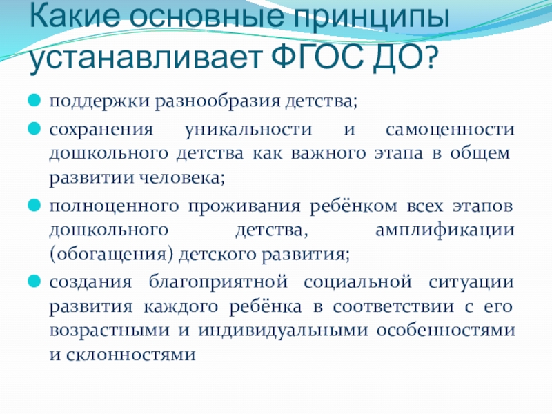 Слайд 5Какие основные принципы устанавливает ФГОС ДО?