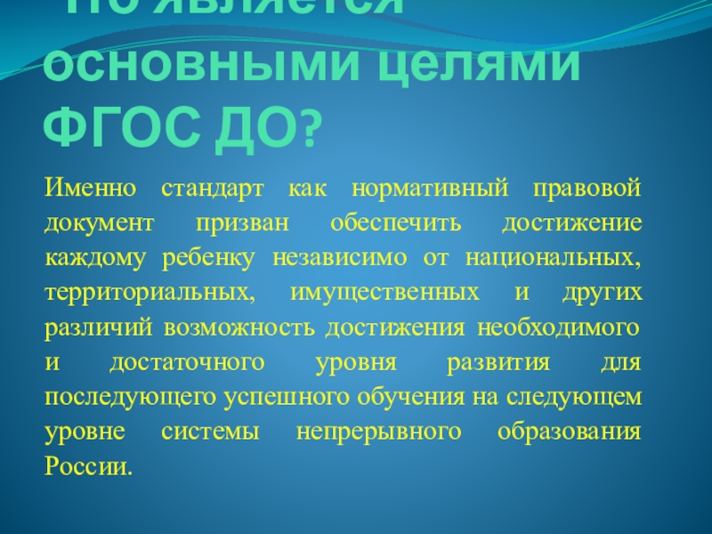 призван обеспечить достижение каждому ребенку независимо от национальных, территориальных, имущественных и других различий возможность достижения необходимого и достаточного уровня развития для последующего успешного обучения на следующем уровне системы непрерывного образования России.