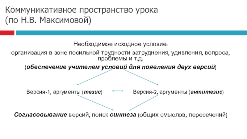 Коммуникативное пространство урока  (по Н.В. Максимовой)Необходимое исходное условие:организация в зоне посильной трудности затруднения, удивления, вопроса, проблемы