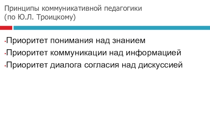 Принципы коммуникативной педагогики (по Ю.Л. Троицкому)Приоритет понимания над знаниемПриоритет коммуникации над информациейПриоритет диалога согласия над дискуссией