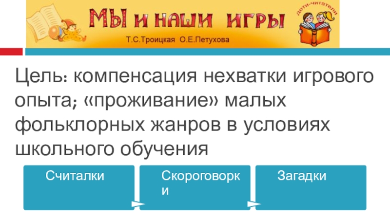 Слайд 4Цель: компенсация нехватки игрового опыта; «проживание» малых фольклорных жанров в условиях